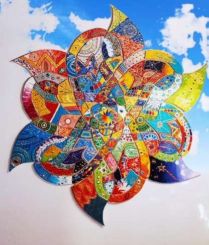 Les « Fleurs-Mandala » se présentent sous la forme d'un kit de 103 pièces prédécoupées à peindre, puis à assembler et à coller sur un fond de carton mousse, non fourni, qui sera découpé au cutter selon les dimensions de votre fleur. La Fleur-Mandala représente un des modèles les plus énergétiques de la collection, avec une symétrie à 6 branches, incluant 3 étoiles de David en son centre. Une notice détaillée vous indique comment créer le fond avec du bois, du carton, ou du carton-mousse.