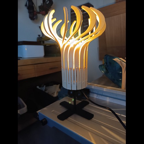 Les pièces découpées en bois brut ou verni. Une notice d'assemblage détaillée. Selon vos choix: Une monture électrique pour petite douille (E14) ou grande douille (E27), une adaptation de la lampe pour une pose en lampe de chevet (voir photo) ou en suspension sur un crochet installé au plafond.