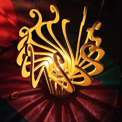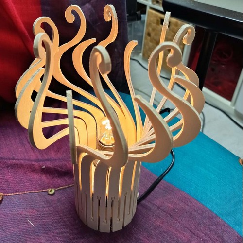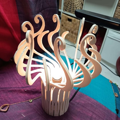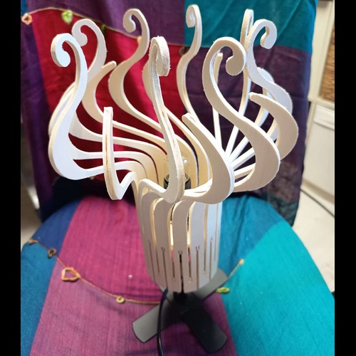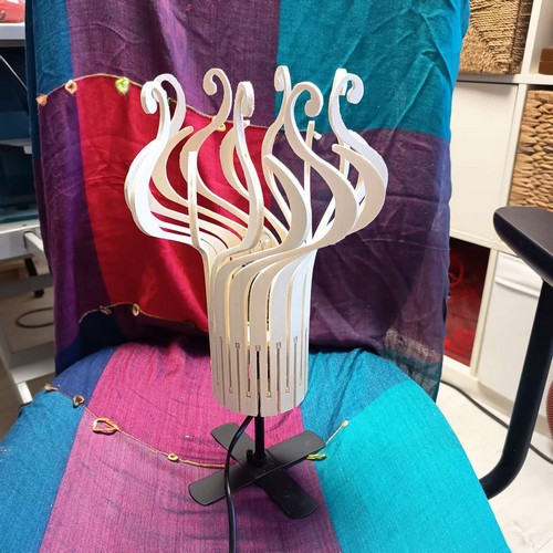 Une lampe design originale livrée à plat, et qui prend son volume une fois montée, par un ingénieux système d'encoches. Les éléments de la lampe ne sont pas individuels, mais tous connectés entre eux par la base, de sorte qu'ils peuvent s'enrouler facilement autour des 2 roues dentées fournies. Cette lampe possède une symétrie différente des autres lampes "design", qui ont toutes leurs branches identiques. Cette lampe a 2 types de banches différents en alternance. Avec un petit supplément, vous pouvez recevoir en plus la monture avec douille à vis E27 ou E14, pour installer votre lampe au plafond, ou la poser sur votre table de chevet (à préciser à la commande dans les options).